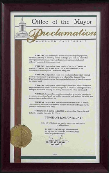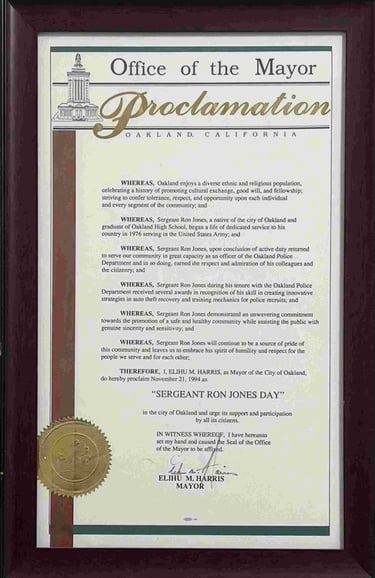 Below is the Mayor's Proclamation declaring November 21, 1994, as "Sergeant Ron Jones Day" is a testament to Ron's profound impact as both a dedicated police sergeant and a cherished member of the Oakland community. His unwavering commitment to service, innovative crime-fighting strategies, and heartfelt dedication to the people of Oakland made him a beloved figure, whose legacy of humility and respect continues to inspire those around him.